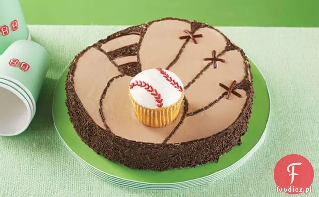 Wyciąć mały kawałek z boku okrągłego ciasta; wyrzucić. Wierzch i bok ciasta z masą budyniową. Udekoruj posypką czekoladową i lukrecją, aby przypominała rękawicę baseballową. Mróz babeczki z pozostałych 2 szklanki bitą polewą.