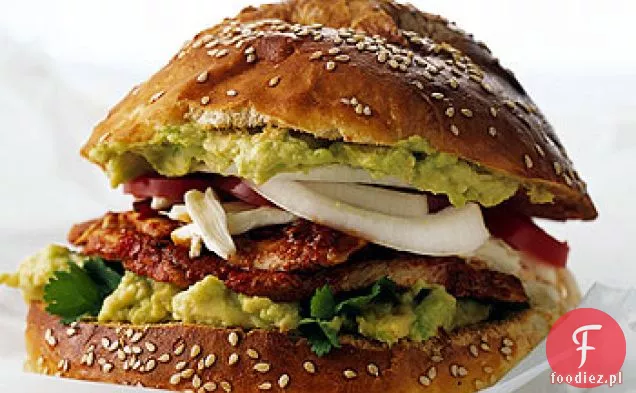 Połowę, Wgłębić i lekko rozgnieść awokado w skórce widelcem, a następnie rozłożyć grubo po ściętych bokach rolek. Doprawić awokado solą, a następnie polać papalo. Zrób kanapki z wieprzowiną, serem, Chipotle (jeśli używasz), cebulą i pomidorem, naciskając kanapki razem.