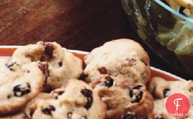 Ubić w jajku i wanilii.Wymieszać suche składniki, następnie rodzynki i orzechy. Upuść ciasto przez zaokrąglone łyżeczki do herbaty na arkuszach.