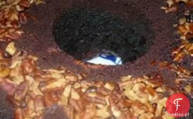 Wlać ciasto na przygotowaną patelnię na wierzchu posiekanych orzechów.