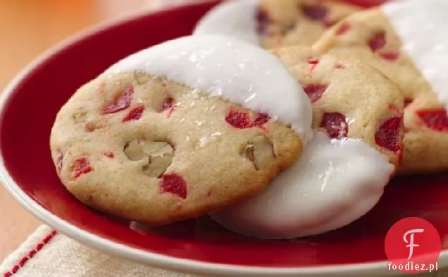 W dużej misce, beat cukier, masło, wanilia, ekstrakt migdałowy i jajko z mikserem elektrycznym na średniej prędkości, aż dobrze wymieszane. Na małej prędkości, ubić w mące, sody oczyszczonej i soli. Wymieszać z wiśniami i orzechami włoskimi.