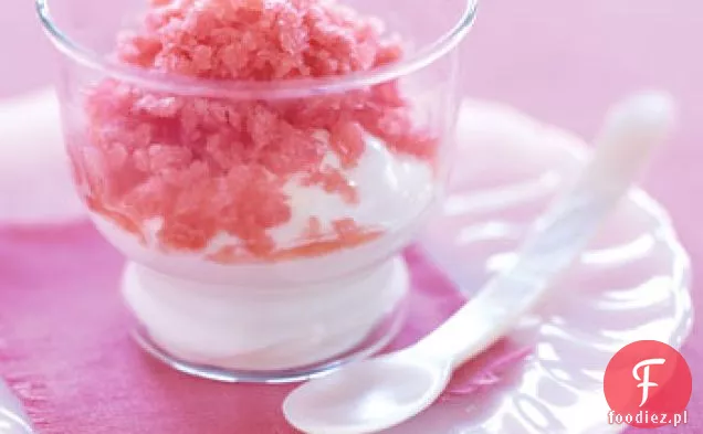 Dodać wodę i sok z cytryny i proces do mieszania. Przecedzić do 8x8x2-calowej metalowej patelni do pieczenia. Przykryć folią i wstawić do zamrażarki. Wymieszać widelcem co godzinę, aż do zamrożenia, około 4 godzin. Czy do przodu można zrobić 2 dni do przodu. Zamrozić. Za pomocą widelca zeskrobać granitę na długość patelni, tworząc lodowate płatki. Wróć do zamrażarki. Ubij 1 szklankę schłodzonej śmietany do ubijania, aż utworzą się jędrne szczyty. Śmietanę podzielić między potrawy. Łyżka granity i podawać natychmiast.