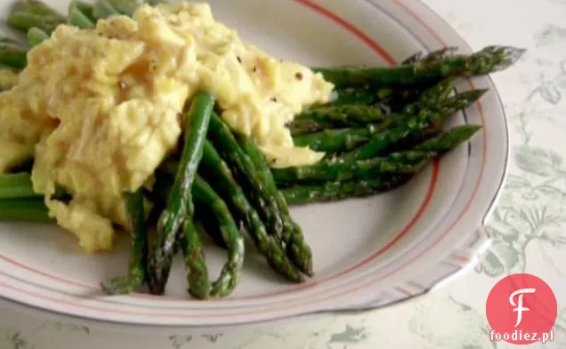Rozgrzać półmisek lub talerze do serwowania w nagrzanym piekarniku niskotemperaturowym lub kuchenkę mikrofalową przez 6 do 10 sekund. Na rozgrzanym talerzu rozsypać Prażone szparagi, a na szparagach łyżkę jajecznicy. Jedz natychmiast i ciesz się!