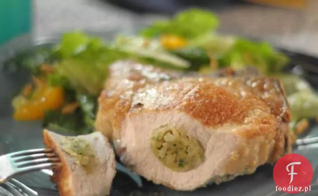 Aby wyciąć kieszenie w kotlety wieprzowe, włóż punkt małego ostrego noża poziomo do pokrytej tłuszczem krawędzi. Przesuwaj nóż w przód iw tył, aby utworzyć głęboką kieszeń o szerokości około 1 1/2 cala.