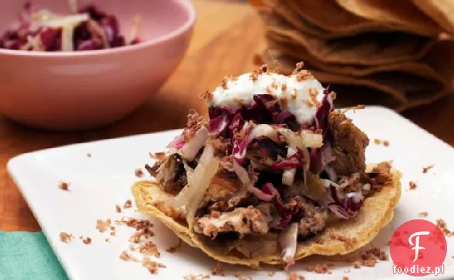 Umieścić każdą skorupę tostada na indywidualnym talerzu. Kurczaka rozdrobnić; podzielić równomiernie na skorupki. Na wierzch każdej z nich nałożyć mieszankę endywiowo-radicchio i kwaśną śmietanę.