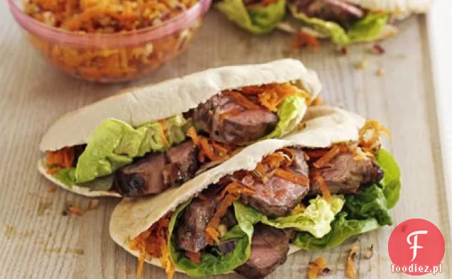 Rozgrzej pieczywo pitta na patelni z grilla lub patelni, a następnie zrób szczelinę w każdym, aby utworzyć kieszeń. Pokroić jagnięcinę i studzić w pittach z sałatką z marchwi i liśćmi sałaty.