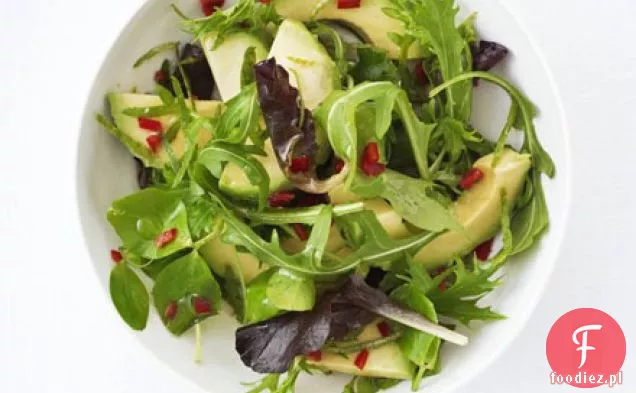 Połączyć składniki dressingu i doprawić. Wrzucić przez plasterki awokado i mieszane liście.