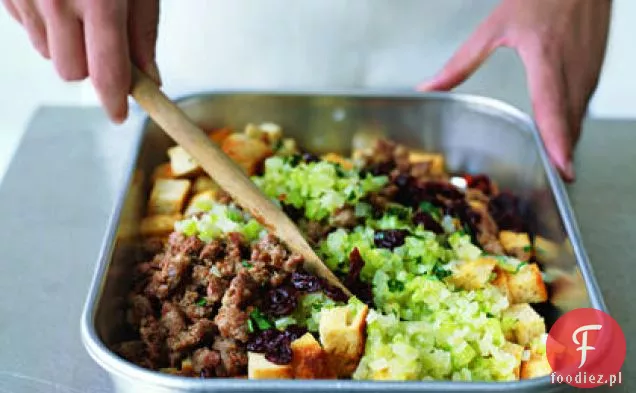 Dodaj seler i cebulę i gotować, aż półprzezroczyste, 5 do 7 protokół. W dużej misce lub patelni połączyć seler i cebulę z chlebem, wiśniami, kiełbasą, pietruszką, solą i pieprzem.