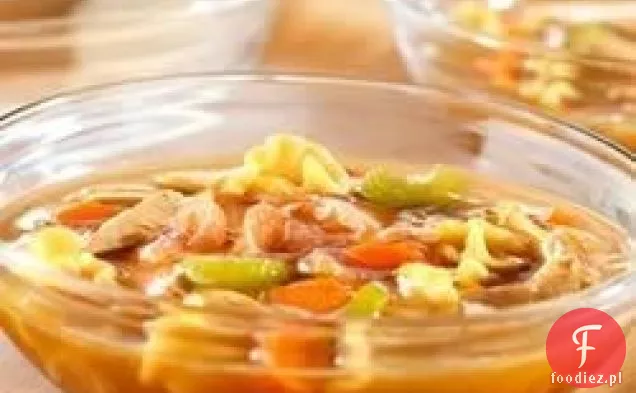 Rozgrzać bulion, czarny pieprz, marchew i seler w rondlu 4-quart na średnim ogniu do wrzenia. Wymieszaj makaron i kurczaka w rondlu. Zmniejszyć ciepło do średniego. Gotować 10 minut lub do makaronu jest miękka. Cebulę wymieszać i podawać natychmiast.