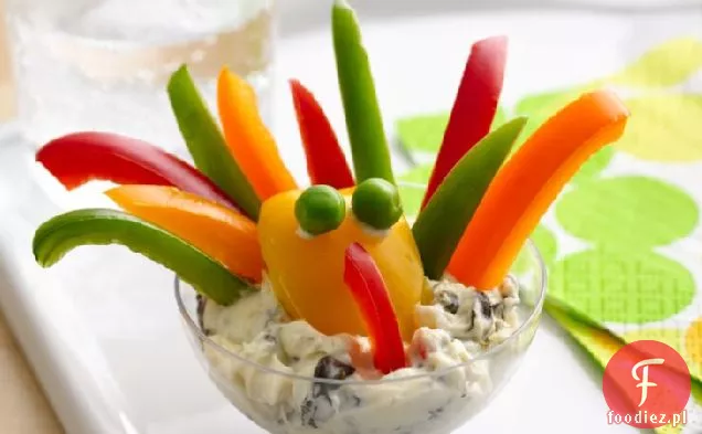 Włożyć głowę indyka do filiżanki; dodać groszek do oczu za pomocą Dipu szpinakowego. Włóż Trójkąt pieprzowy do indyka.