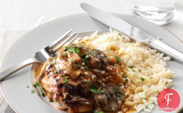 Piec pod przykryciem w temperaturze 350° przez 35 minut. Odkryć; piecz jeszcze 15-20 minut lub do momentu, gdy termometr włożony do kurczaka będzie wskazywał 180°.
