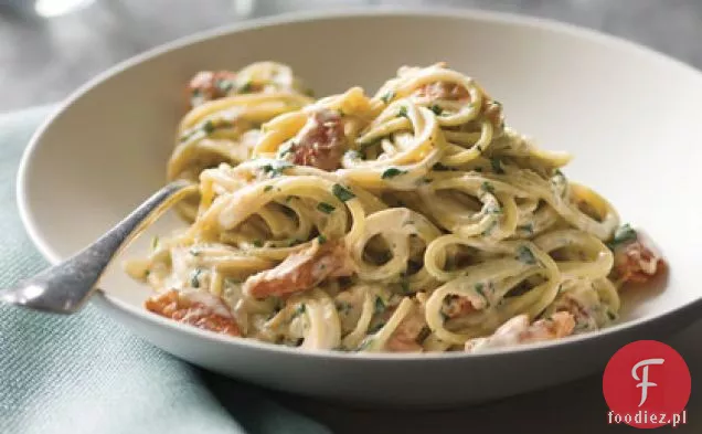 Wlać makaron na patelnię z mieszaniną śmietany łososiowej i wrzucić do pokrycia, dodając trochę wody do gotowania w razie potrzeby, aby zwilżyć makaron.